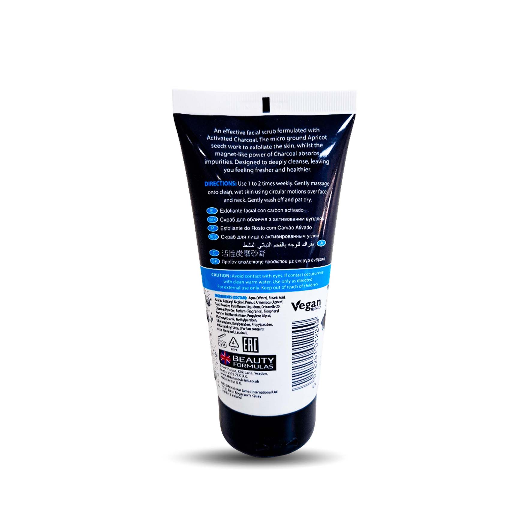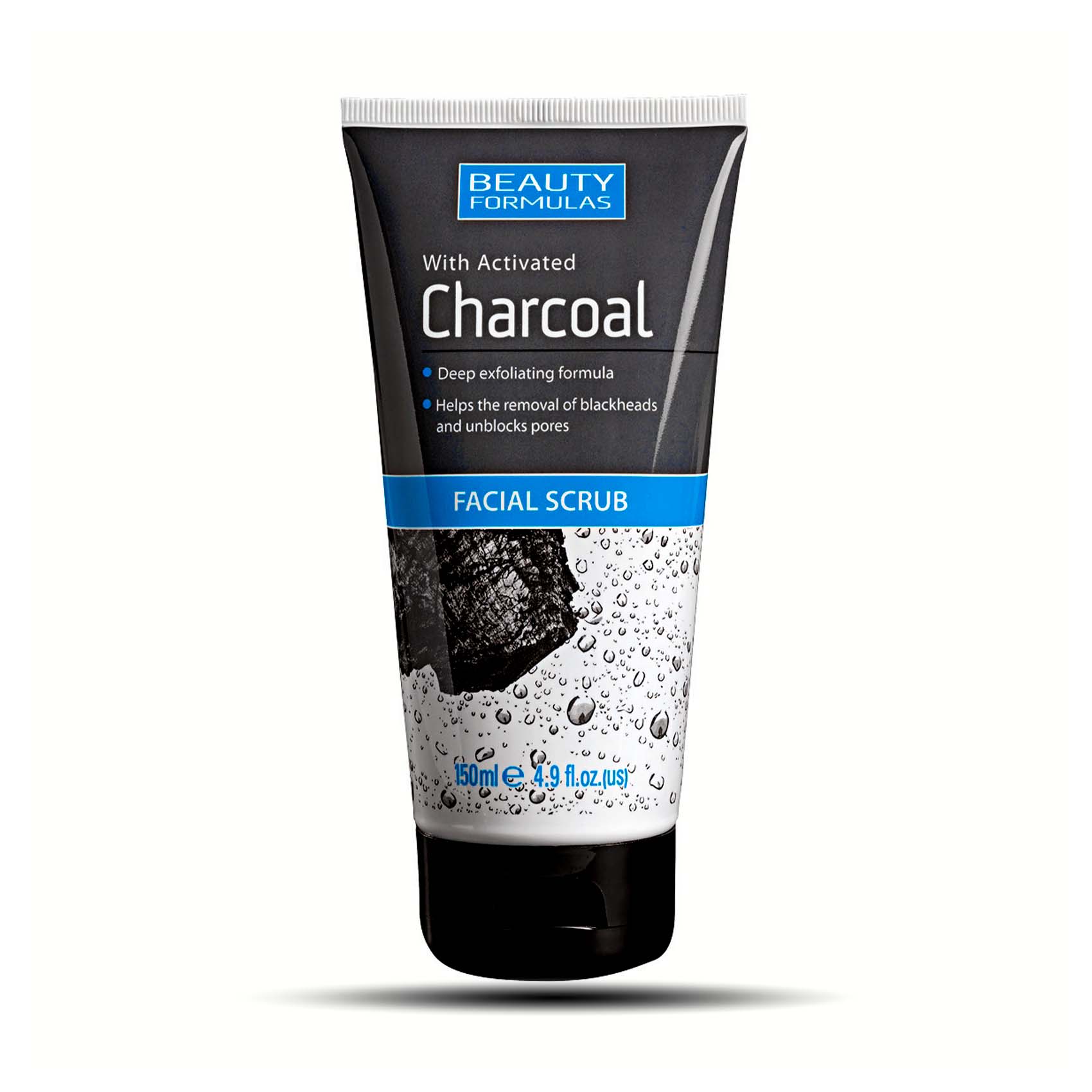- 150ml facial scrub with activated charcoal and micro-exfoliating beads.